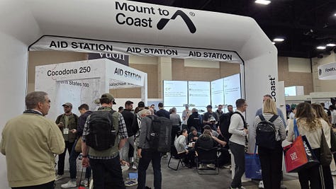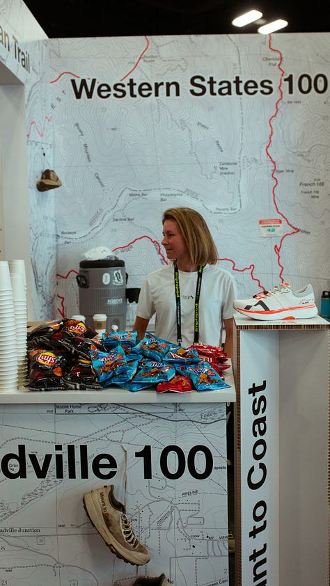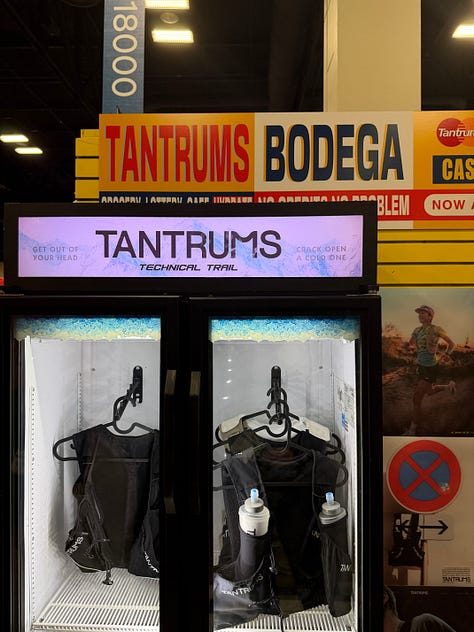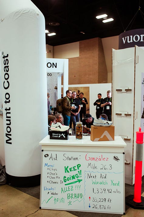 Mount to Coast Also related: the Mount to Coast booth (out of China) was very busy with a prime location. I loved the H1 and am excited to try their new M1 that combines everything great about the T1 and H1 to create a long-trail shoe - I’m still a trail shoe nerd after all. The product is great but the secret sauce is combining that with cultural storytelling in the US that is better than other Chinese brands. Their booth was creatively setup as an aid station. I love this so much. It tells a story about the brand and provides a POV that a generic booth does not. This trend got me excited . . .