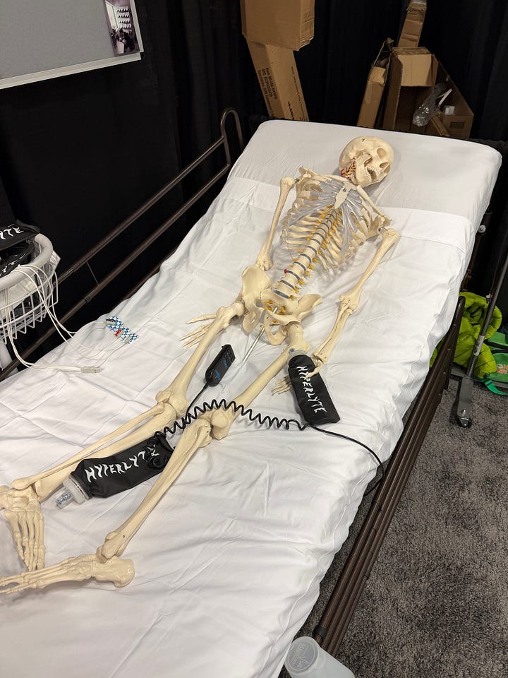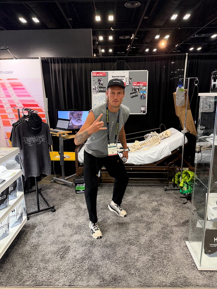 Hyperlyte also deserves a nod for 1) beginning to build a solid nutrition business with a level of creativity perhaps lacking across nutrition brands and 2) going conceptual on their booth concept. They found a hospital gurney, skeleton and IV setup to really represent how we feel when we don’t fuel properly, plus it’s a bit metal like the brand. Founder, Emory Atterberry is a great storyteller himself and I listened for a while as he gave me the BTS thought process on their product, business and partnerships. Good stuff. Did you know their scrappy film on Hans Troyer now has 1.7 million views since June? Some much bigger running brand films are getting (checks notes) around 5k views in the same timeframe. Wild.